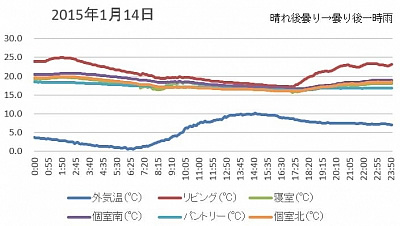 これはある日の沢渡の家の一日の温度をグラフ化したものです。