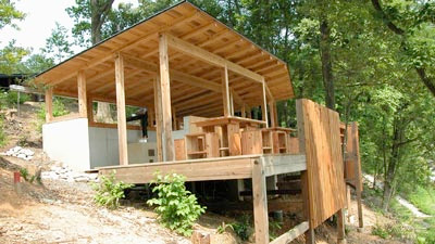 岬状に突き出した斜面地に建設され、南側に張り出したデッキ、4基の焚口を持つカマド、余熱を利用したオーブン、輻射熱暖房「ペチカ」を装備している。